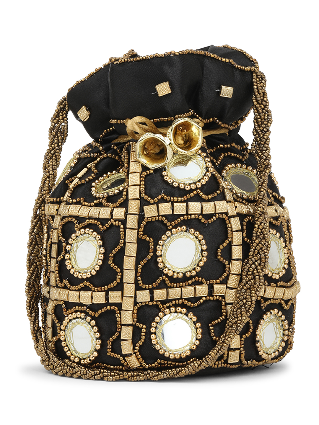 Black and gold-toned embellished potli clutches Has wrist loop 1 main compartment with drawstring closure Size & Fit Length 8Inches Depth 2Inches Width 5Inches Material & Care Fabric Wipe with clean, dry cloth