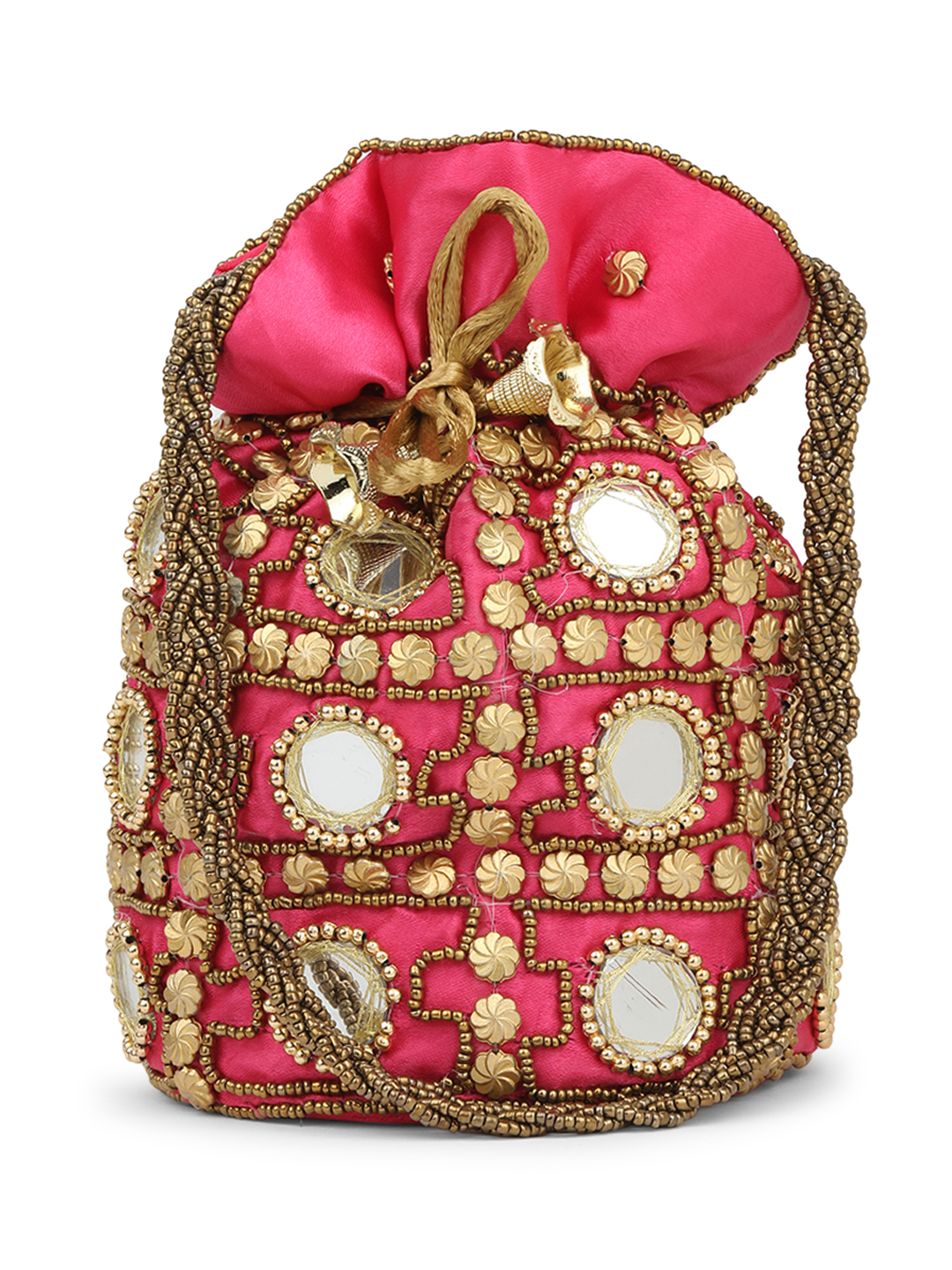Red and gold-toned embroidered potli clutches Has wrist loop 1 main compartment with drawstring closure Size & Fit Height: Width: Depth: Material & Care Wipe with clean, dry cloth